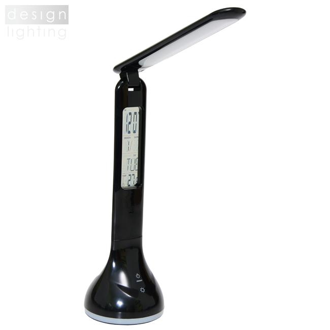 Moderní sklápěcí kancelářská lampička s možností výběru barveného podsvětlení základny a regulací intenzity světla. Lampa je vybavena vestavěnou lithiovou baterií (max. 2 hodiny provozu) a praktickým, průhledným displejem, který zobrazuje čas, datum, den v týdnu a okolní teplotu. Využívá vysoce úspornou SMD LED technologii s dlouhou životností. Stupeň krytí je IP20 - určeno pro vnitřní použití.