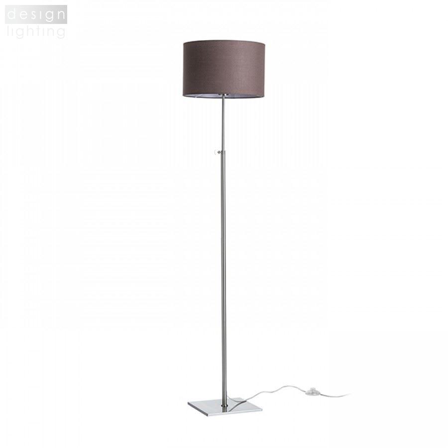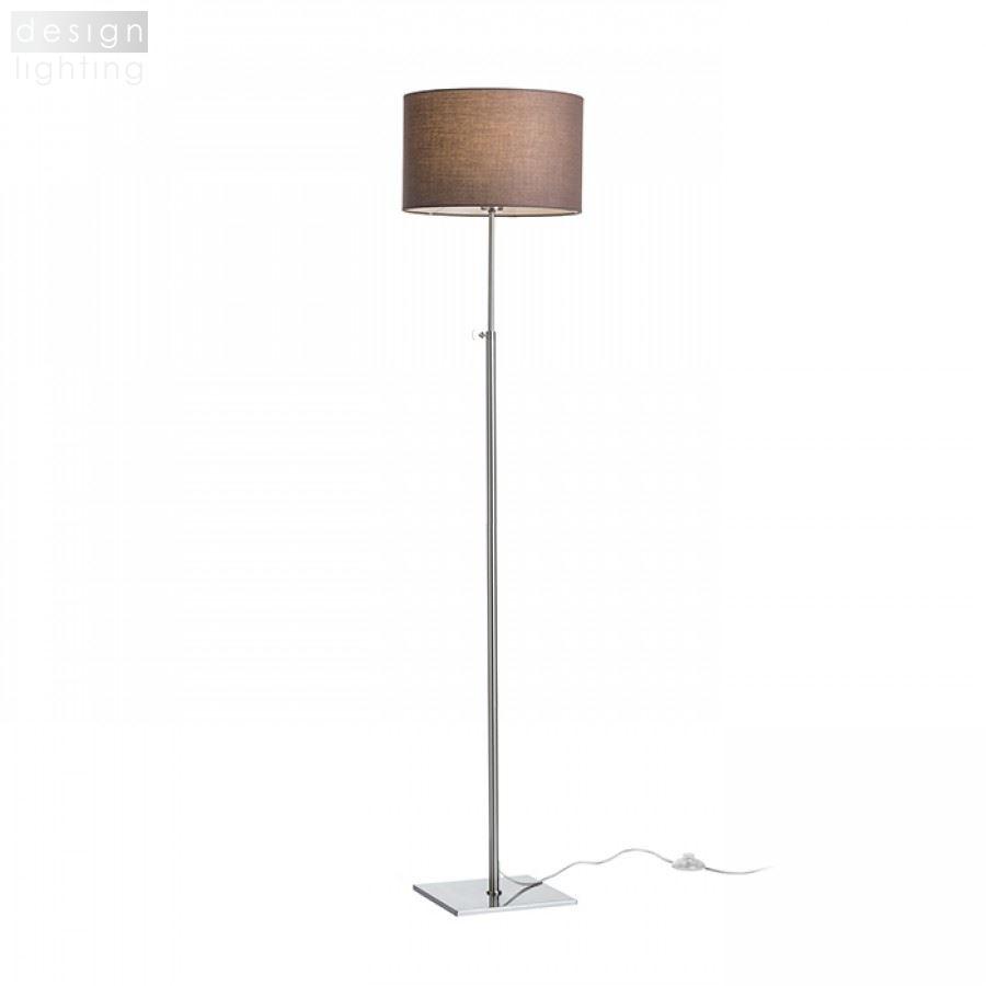 Stojanová niklová lampa s teleskopickou nohou a textilním stínidlem uchyceným na E27 závit.