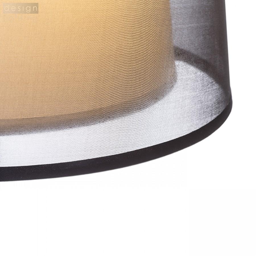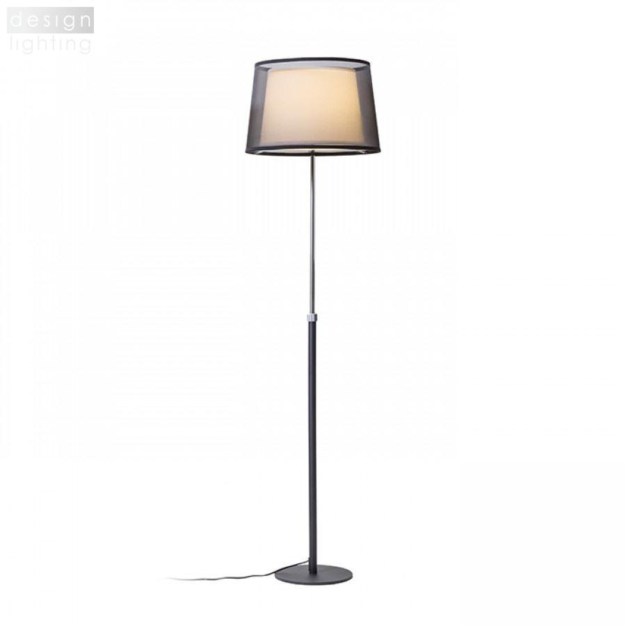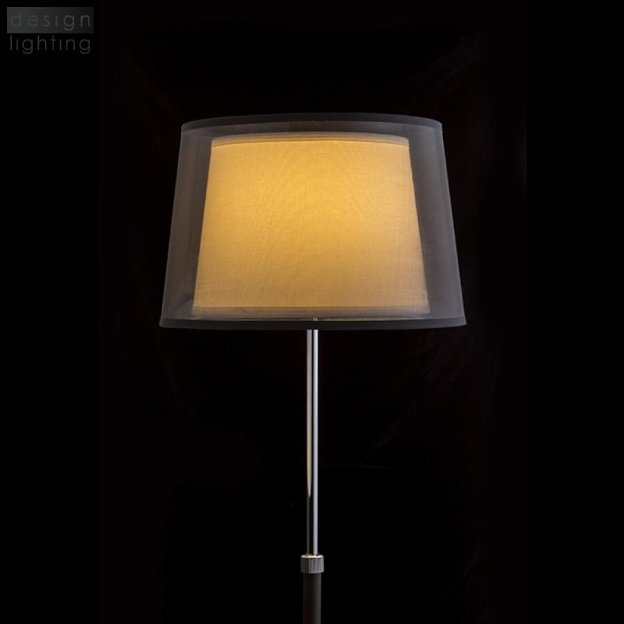 Stojanová lampa s dvojitým textilním stínidlem a teleskopickou nohou pro nastavení výšky svítidla.